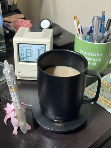 While it really is more of a snapshot than a well-thought-out photograph, I kind of love that it’s a slice-of-life snapshot. The Ember mug that Aaron got me a couple Christmases ago is front and center, flanked by the axolotl pen holder that I got Connor as a stocking stuffer last year and subsequently reappropriated for my own, and the mug rug I made a few years back as a quilt-as-you-go test.