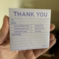 According to the copyright on the back of this shrink-wrapped pad of novelty sticky notes, I bought these at least 20 years ago. I do have another pad of them that’s been opened and used, but I use them so rarely that I decided that the new-old-stock stickies could go in the thrift box to brighten someone else’s day.